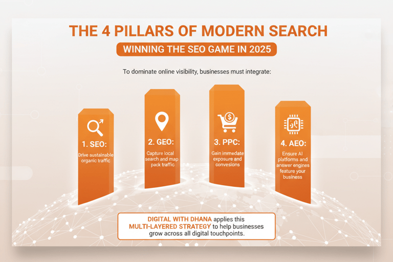 Everyone says “Do SEO,” but search today is no longer just one thing. Businesses must now optimize across *SEO, GEO, PPC, and AEO* to dominate visibility online. While SEO drives organic traffic, GEO ensures top local map results, PPC provides immediate exposure, and AEO (Answer Engine Optimization) ensures AI-powered answers appear at the top. The modern digital marketing expert, like Dhana Sekaran of Digital with Dhana, combines these strategies to deliver full-spectrum online visibility.
